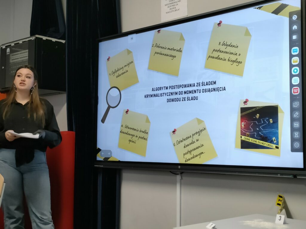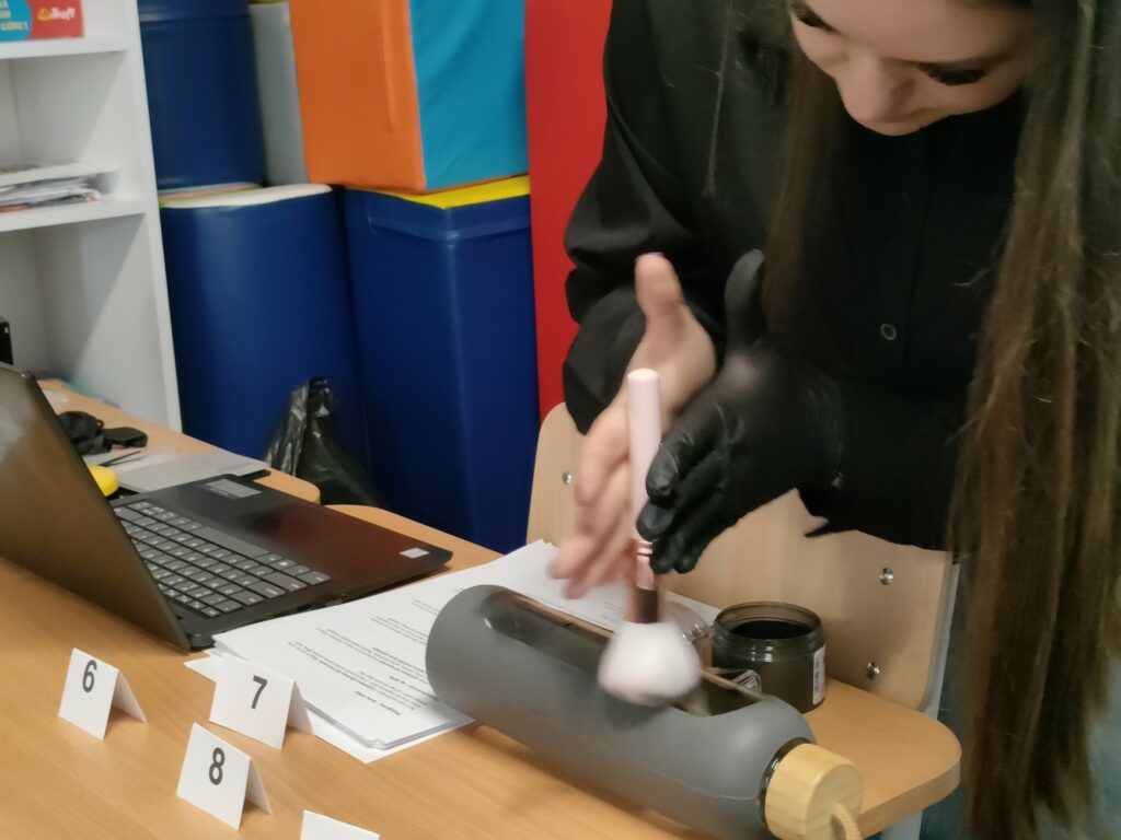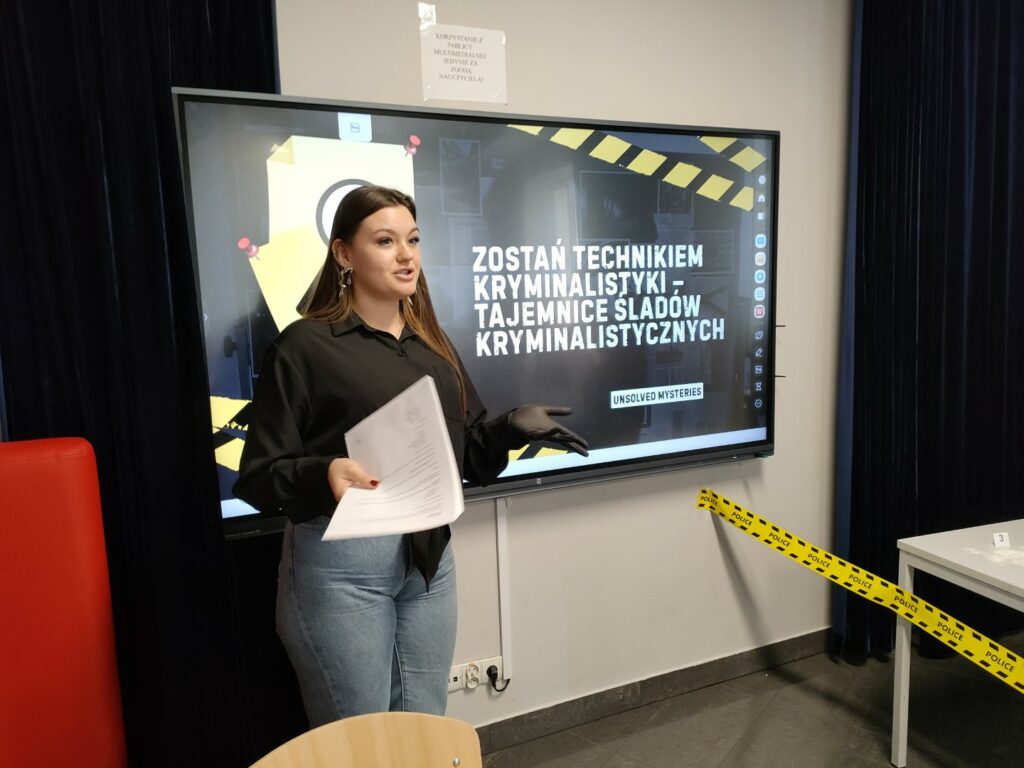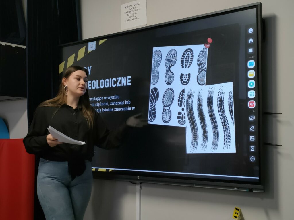 Uczniowie klas 4–8 wzięli udział w warsztatach pt. „Zostań technikiem kryminalistyki – tajemnice śladów kryminalistycznych”. Podczas zajęć poznali, na czym polega praca technika kryminalistyki oraz jak ujawnia się i zabezpiecza ślady na miejscu zdarzenia. Najwięcej emocji wzbudziła część praktyczna – uczniowie samodzielnie wykonywali i analizowali odciski palców, poznając w praktyce podstawy pracy w kryminalistyce.