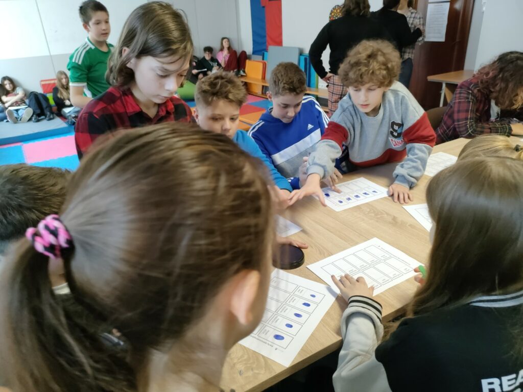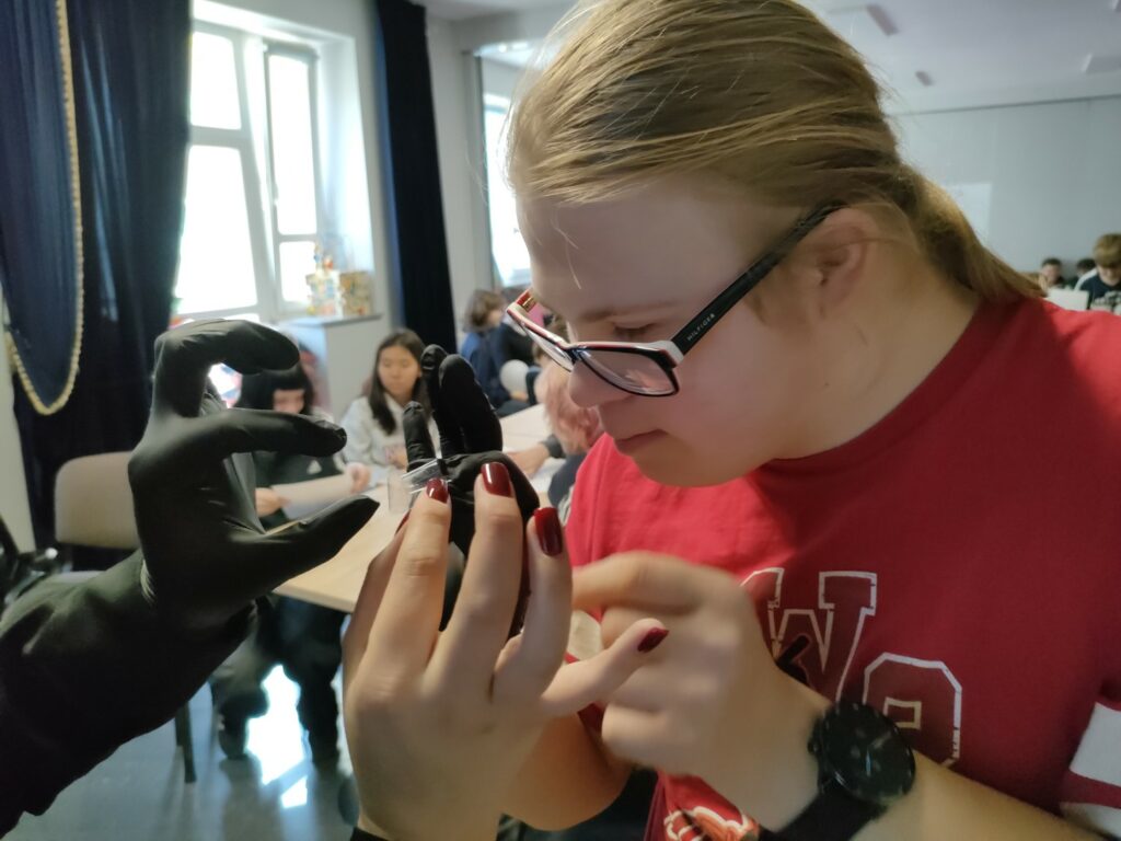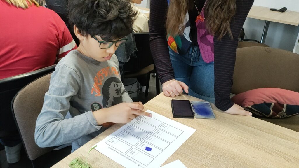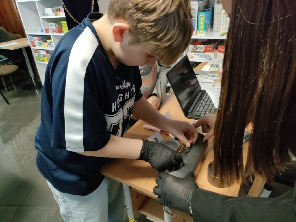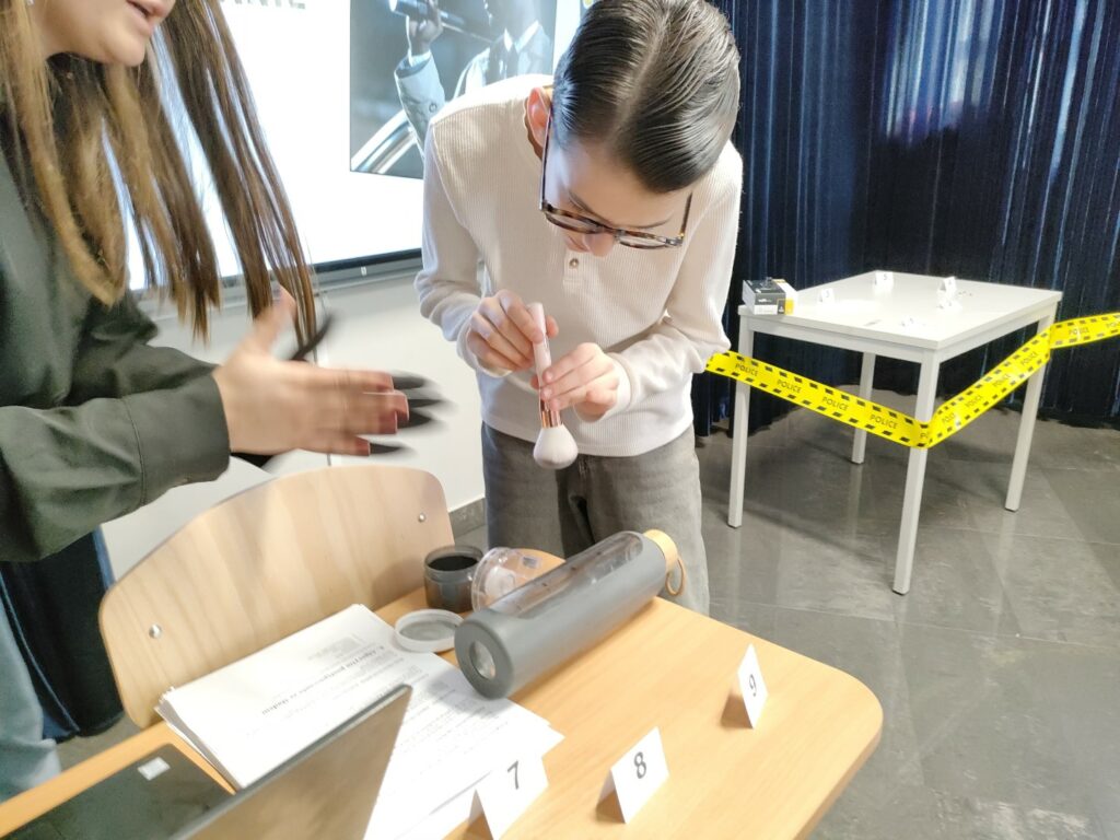 Uczniowie klas 4–8 wzięli udział w warsztatach pt. „Zostań technikiem kryminalistyki – tajemnice śladów kryminalistycznych”. Podczas zajęć poznali, na czym polega praca technika kryminalistyki oraz jak ujawnia się i zabezpiecza ślady na miejscu zdarzenia. Najwięcej emocji wzbudziła część praktyczna – uczniowie samodzielnie wykonywali i analizowali odciski palców, poznając w praktyce podstawy pracy w kryminalistyce.